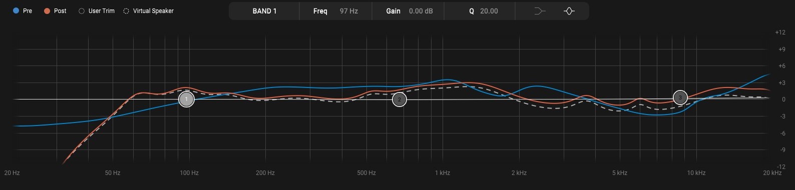 Per migliorare la percezione del soundstage, è presente Ambience: il suo effetto va valutato di volta in volta in base alle finalità di ascolto. Può essere molto piacevole come anche distraente se si lavora per esempio su tracce percussive molto secche, dove si richiede la massima concentrazione nei transienti e nei decadimenti. L’abilitazione dei Virtual Speaker introduce una risposta in frequenza differente, che si può visualizzare nel grafico della riposta in frequenza come linea tratteggiata, che sarà applicata all’uscita audio, successivamente alla calibrazione. Studio Simulation lavora anche quando Calibration non è attivo, con o senza Virtual Speaker attivato.