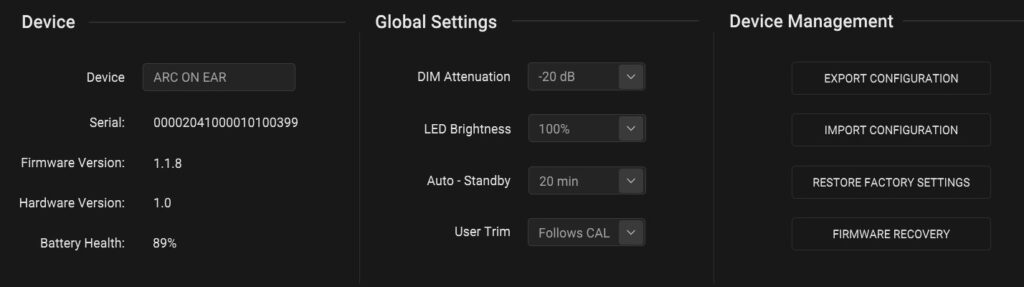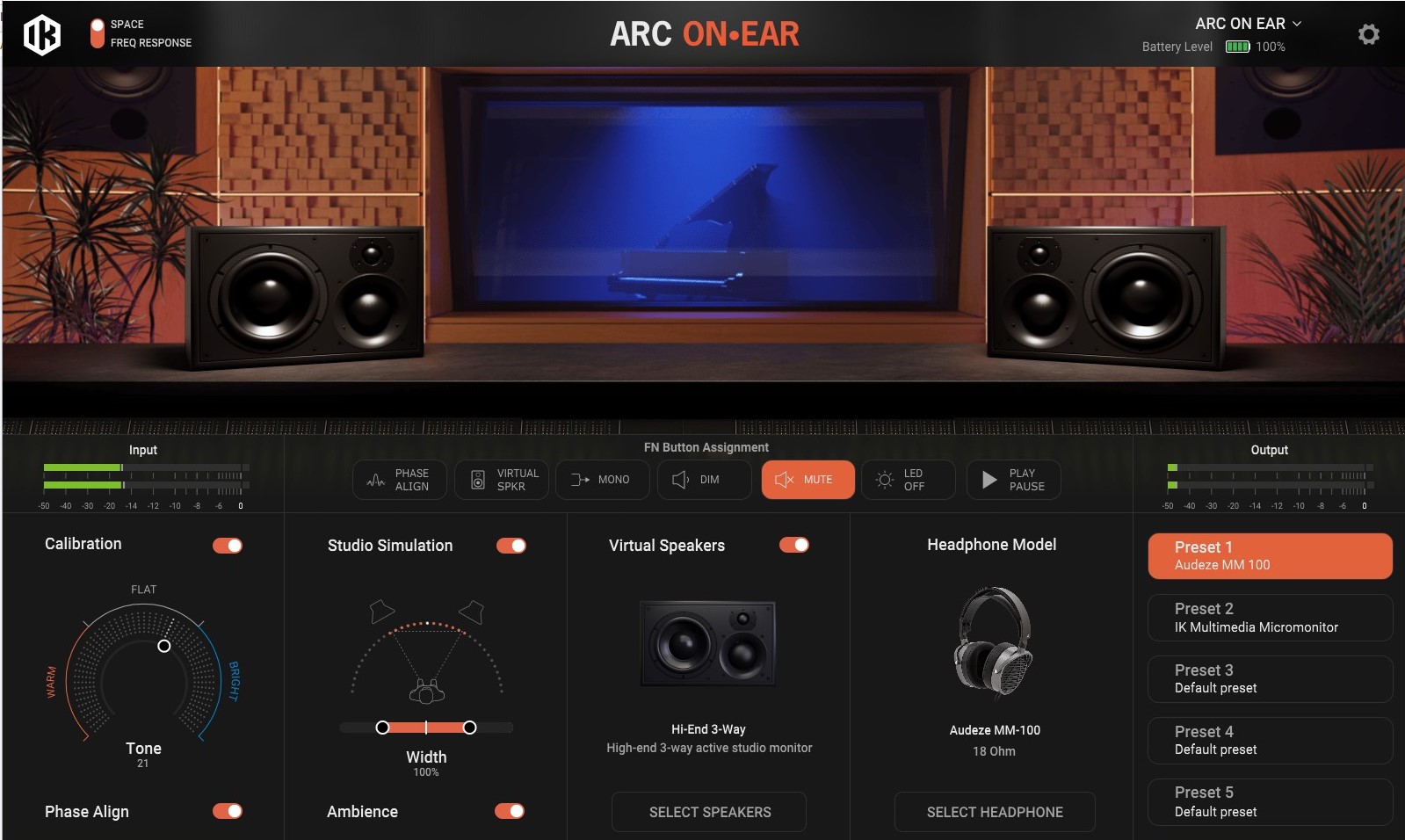 Ci aspettavamo un plugin o un’applicazione standalone, come già visto per altre software house, e invece è arrivato un piccolo hardware, che sta letteralmente nel palmo della mano, esteticamente bello e leggero. ARC ON EAR lavora con il suo convertitore e DSP interno, senza mai sovraccaricare la CPU del computer. L’originalità italiana si vede in una serie di particolari: ARC ON EAR ha una batteria interna per gli permette di lavorare senza alimentazione (all'accensione i led indicano la quantità di carica), presa dalla connessione USB-C, dispone di un ingresso ausiliario esterno in mini-jack, così da poter collegare anche un ingresso analogico, e ha un controllo di volume. Tre pulsanti richiamano l’attivazione di uno dei cinque preset che si possono caricare (FN+CAL per scorrerli ciclicamente) per la calibrazione, l’attivazione della modalità Studio e una terza funzione assegnabile a piacere dall’applicazione standalone.