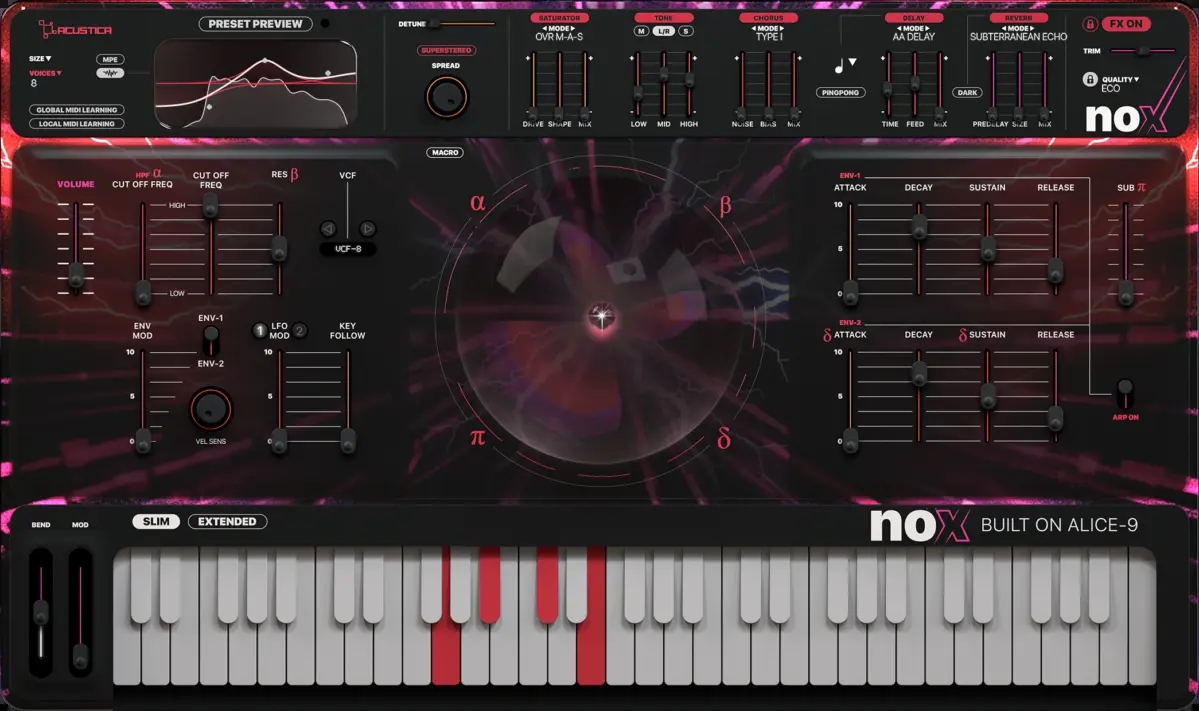 NOX è un sintetizzatore ibrido derivato da Alice9, ma progettato specificamente per generi musicali quali l’EDM e la Melodic Techno. Acustica Audio NOX è dotato di 61 forme d'onda personalizzate che evolvono nel tempo, create appositamente utilizzando il sistema SCO. Queste forme d'onda sono il materiale sorgente per 127 preset, che forniscono profondità, movimento e un carattere espressivo a sonorità ideali per i due generi musicali cui si propone.