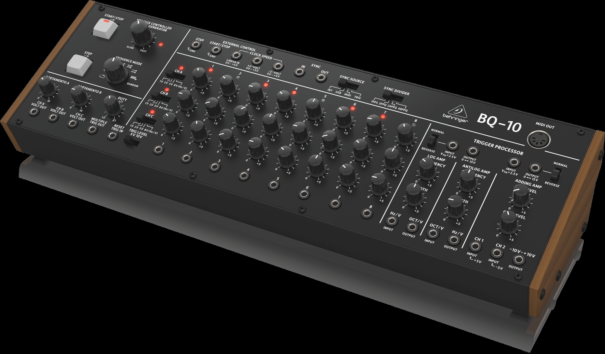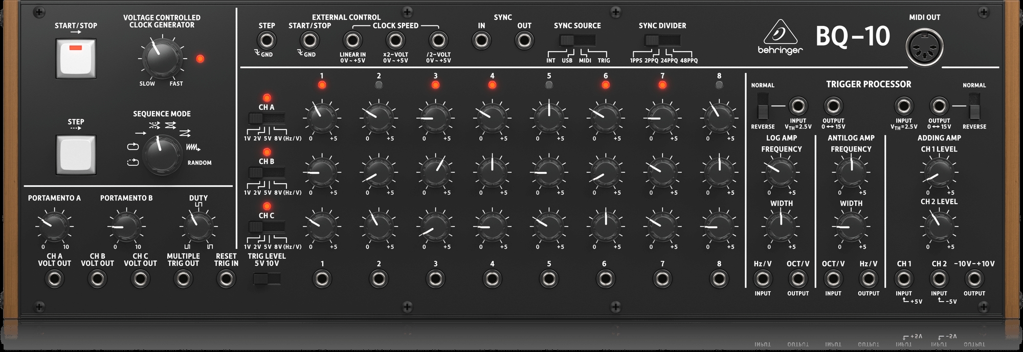 Il Behringer BQ-10 può funzionare come un singolo sequencer a 16 step o suddiviso in due sequenze da 8 step (Canali A e B) per una maggiore flessibilità. Il Canale C è un canale separato a 8 step a cui è possibile collegare un synth esterno come – per esempio - il Behringer K-2 MKII tramite CV per il controllo del filtro o dell'ampiezza. Ogni step è dotato di una manopola di uscita in tensione e di un'uscita trigger dedicata, che consente di abbreviare le sequenze collegando step specifici all'ingresso Reset.