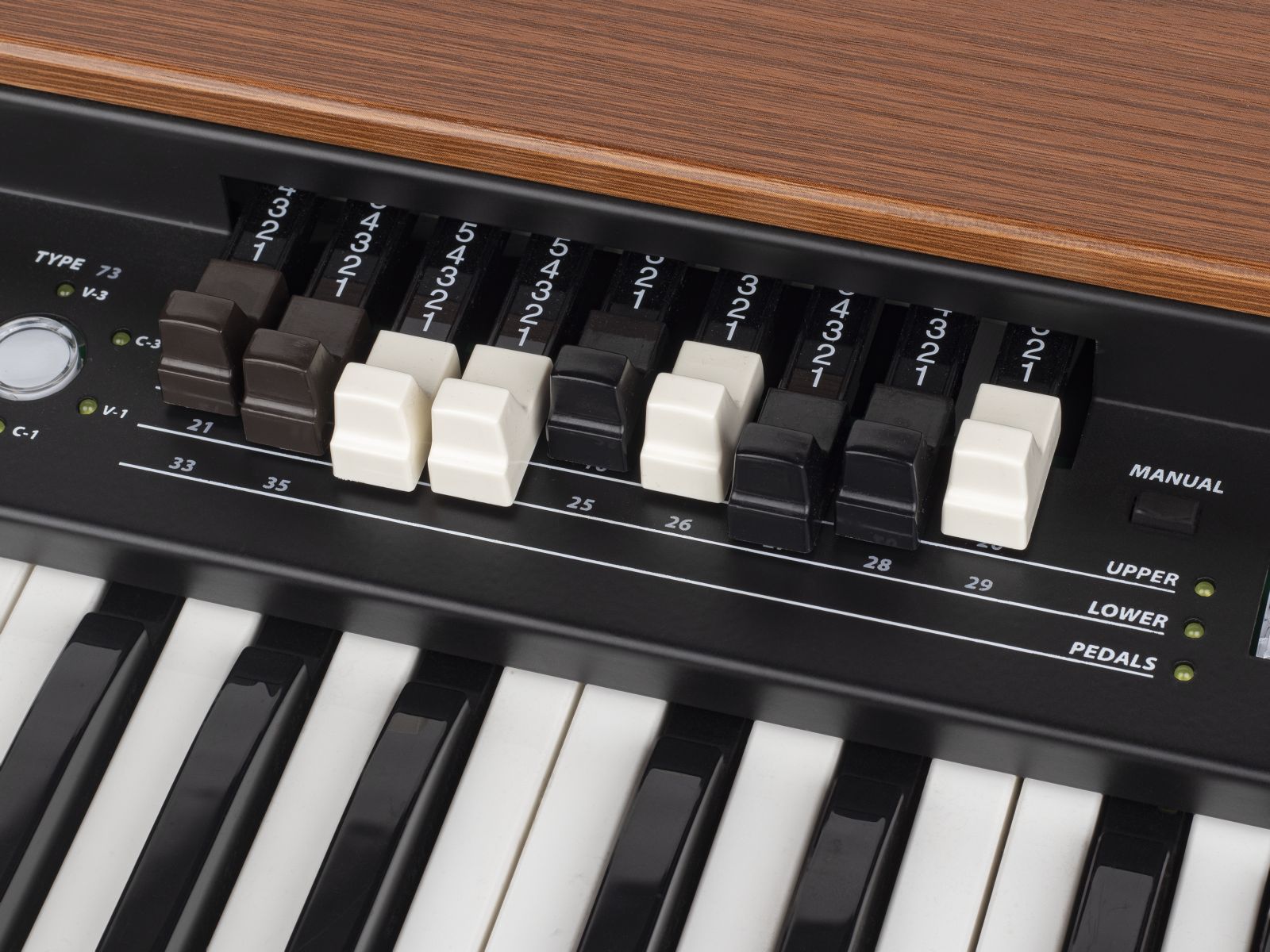 Il pannello di CRUMAR DK61 è composto da nove drawbar, controlli per volume, Drive, riverbero, Rotary, Vibrato, Chorus e percussioni, più una coppia di switch per il cambio preset e quelli per selezionare il manuale superiore, inferiore o la pedaliera. Lo strumento è provvisto di staffe di montaggio per l’Halfmoon opzionale.