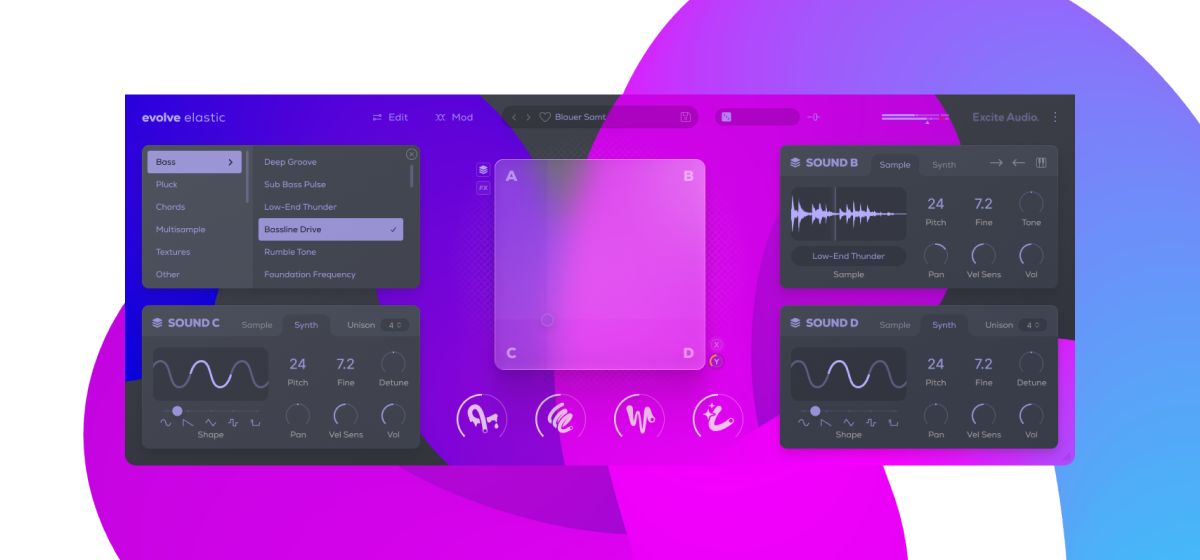 SI può creare un suono partendo da quattro livelli, miscelandoli tra loro con il pad XY e poi definire il mix finale attraverso quattro effetti macro: Melt, Bounce, Stretch e Gloss. Evolve Elastic offre doppi filtri, un potenziale di modulazione infinito e 16 moduli di effetti per alimentare i suoi 250 preset creati dal team di sound designer professionisti di Excite Audio.