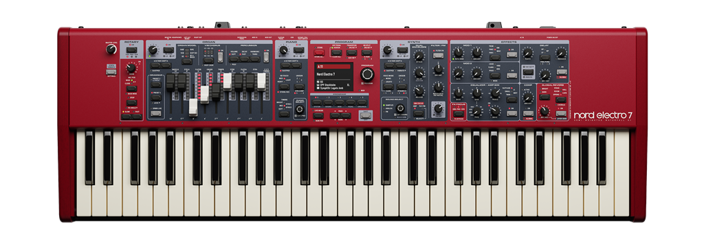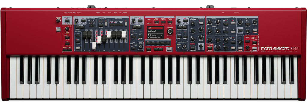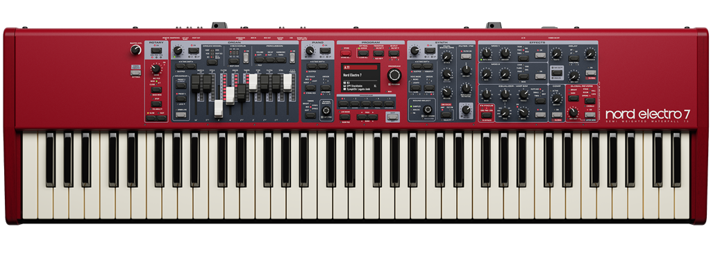 In questa nuova versione spicca il pannello comandi ridisegnato, in cui Nord introduce inoltre un ampio display a colori. Sempre riguardo al pannello, da questa serie è stato uniformato il parco controlli e anche la versione 7 HP dispone del set di drawbar nella sezione Organ. Sempre nel modello HP fa il suo esordio la meccanica Hammer Action Triple Sensor di Kawai, qui nell’originale variante a 73 note. I Nord Electro 7 a 61 e 73 tasti montano sempre una meccanica con tasto di tipo Waterfall. Passiamo ad esaminare i vari motori sonori.