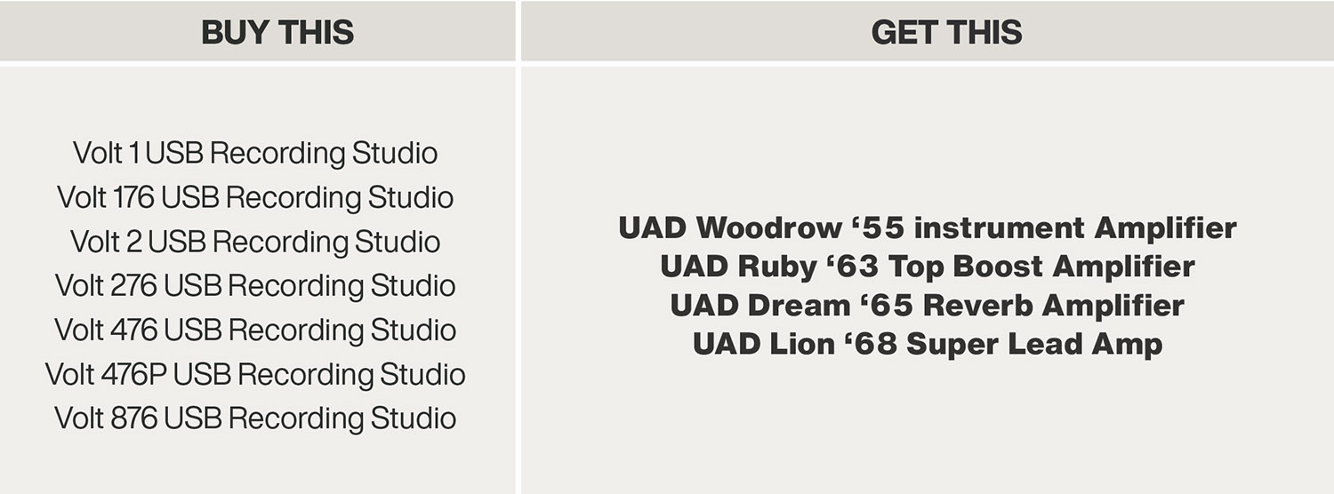 Acquistando un’interfaccia Universal Audio Volt USB Recording Studio si riceve in regalo il bundle UAD Guitar Amp!